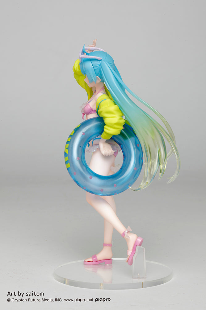 Taito is happy to present the prize figure of Hatsune Miku in a fun summer outfit! With her traditional hairstyle and brightly colored hoodie and innertube she’s ready for a day at the beach.